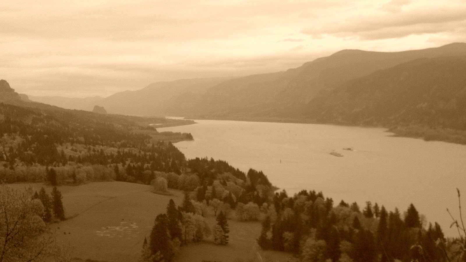 This is a picture of the Gorge I took a few months ago. You will notice a prominence to the left, in the distance, that is Beacon Rock. I hear there is a trail that will take you to the top of that rock. As for the train, they built a tunnel that goes right through Beacon Rock. I took a picture in Sepia to see how it would turn out.